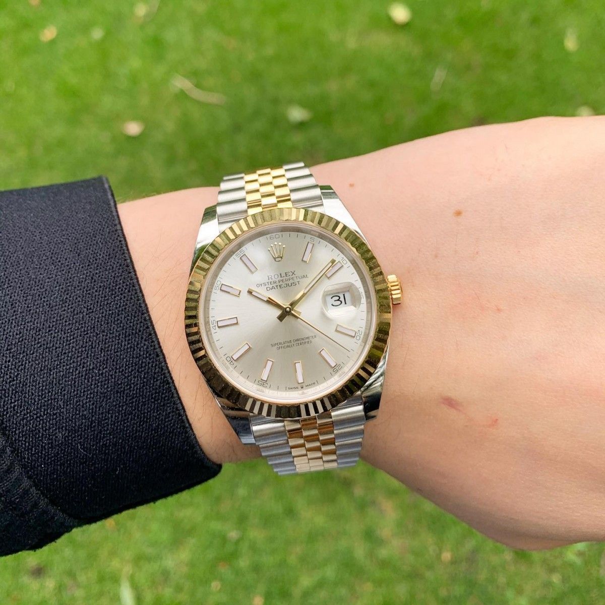 What a month this has been, but we’re not done yet! Another piece we had in and out our doors quick was the Audemars Piguet Royal Oak Offshore finished in stainless steel with a navy dial featuring a chronograph. This sat on a navy rubber strap. Shortly after this, we sourced a Rolex bimetal Datejust41 on a jubilee bracelet with a Sun Dust dial.